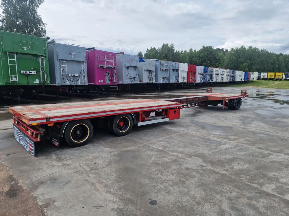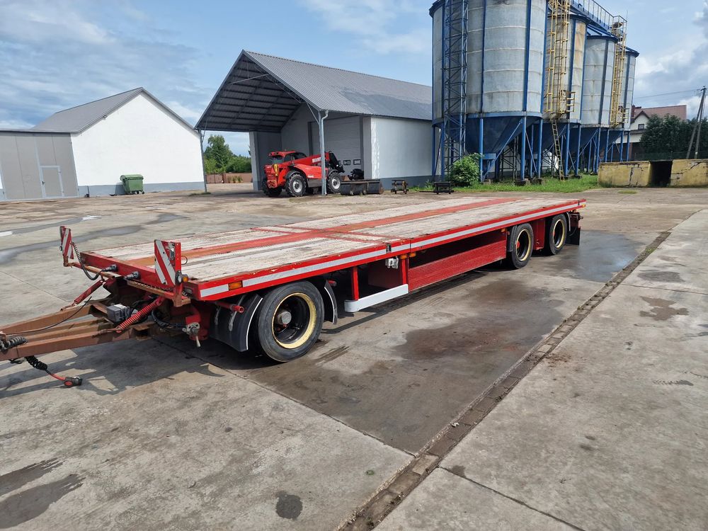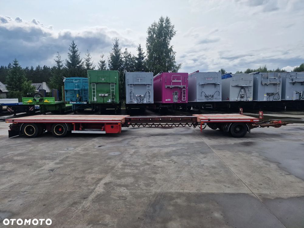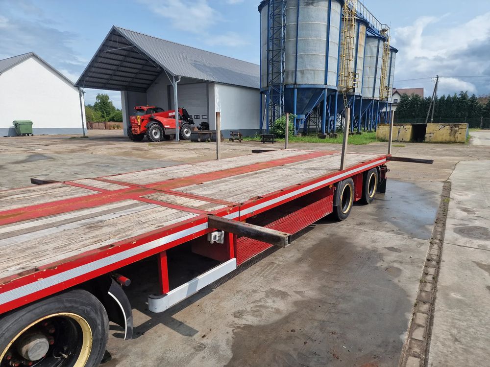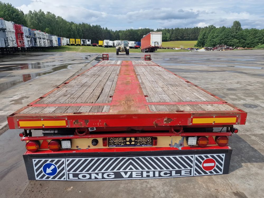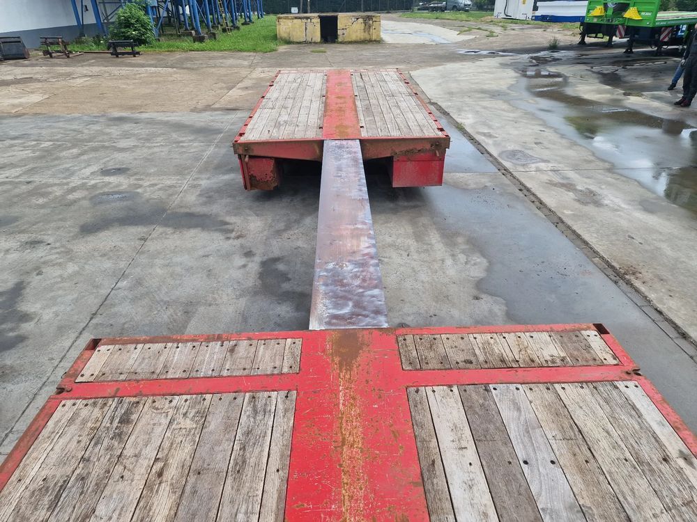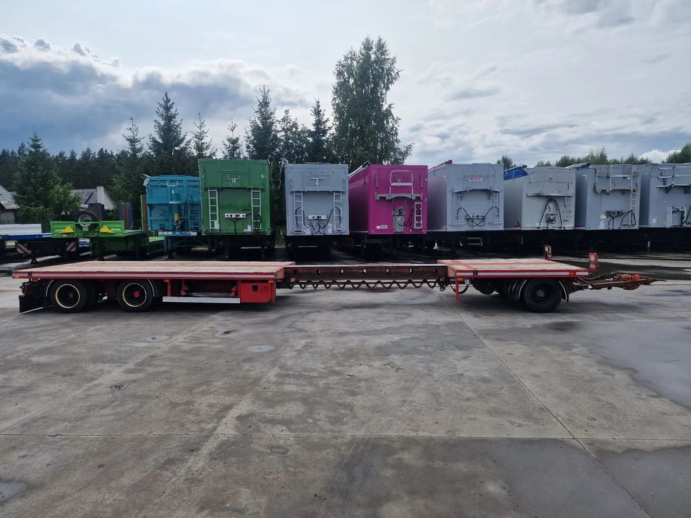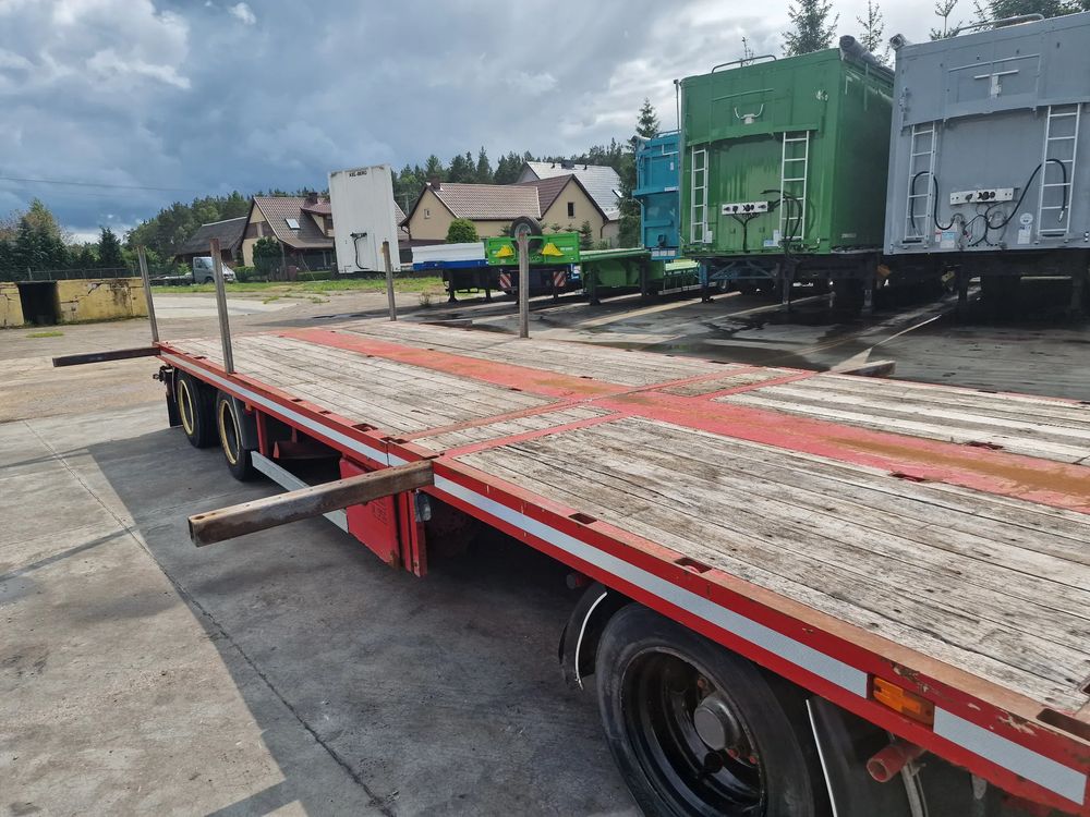 BROSHUIS przyczepa platforma niskopodwoziowa 2005 rok; ABS; pneumatyczne zawieszenie; 3 osie BPW; hamulce bębnowe; ostatnia oś podnoszona; długość 7,50 m + rozciągana 3,50 m; szerokość 2, 48 m (możliwość poszerzenia); wysokość: 0,80 m; DMC: 19800 kg; masa własna: 5850 kg; ładowność: 13950 kg;