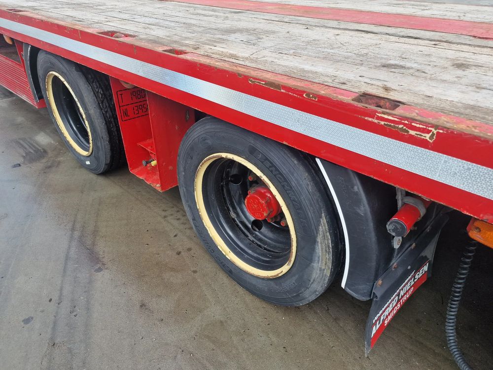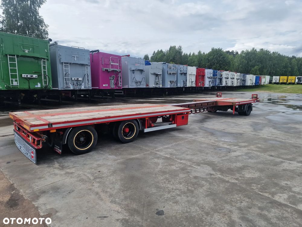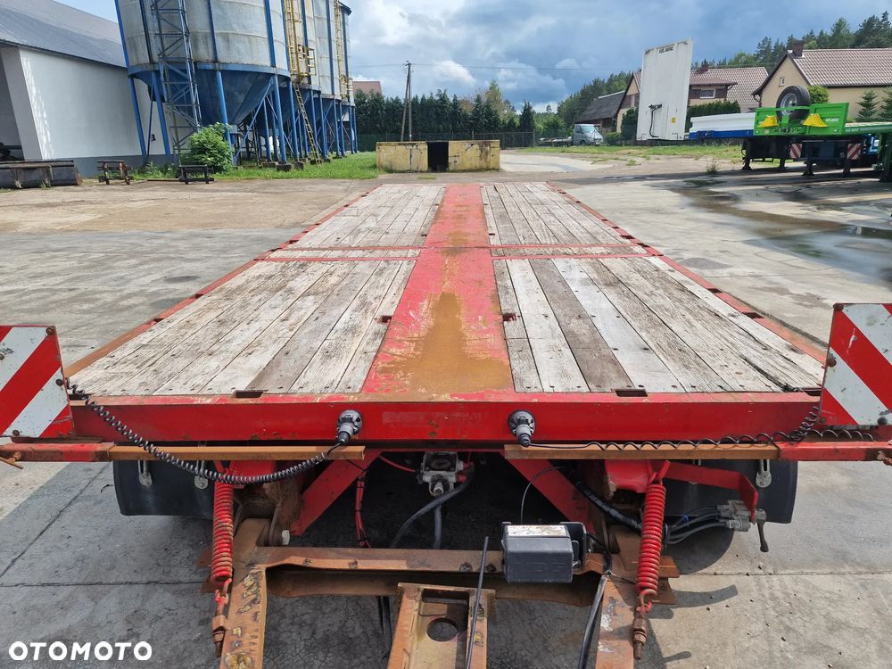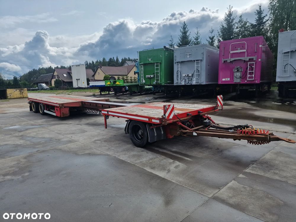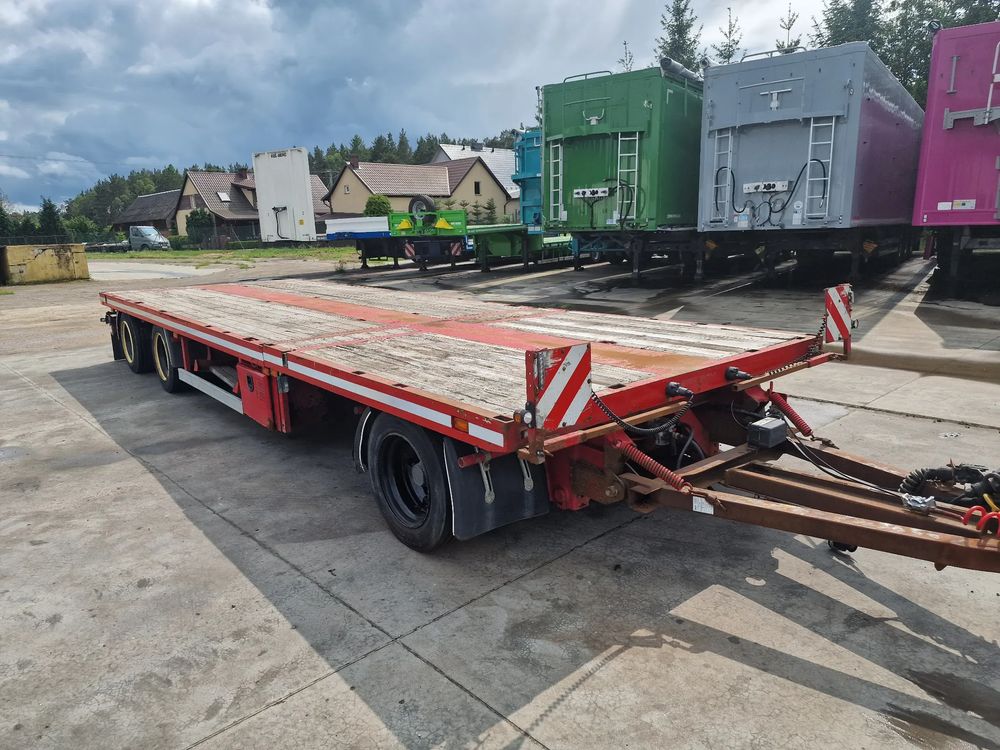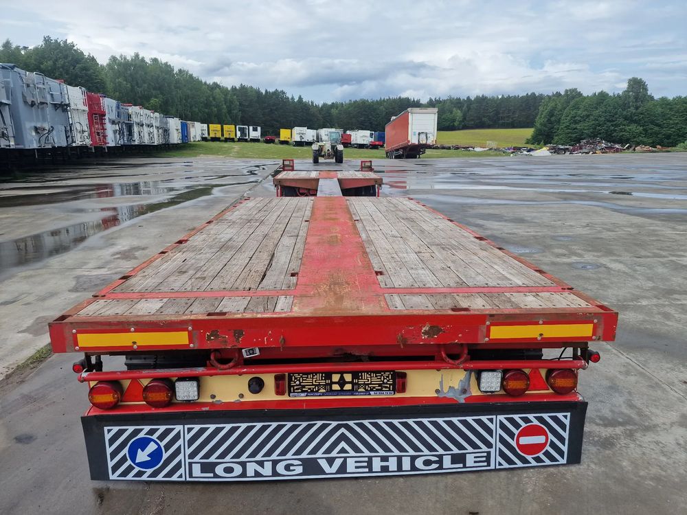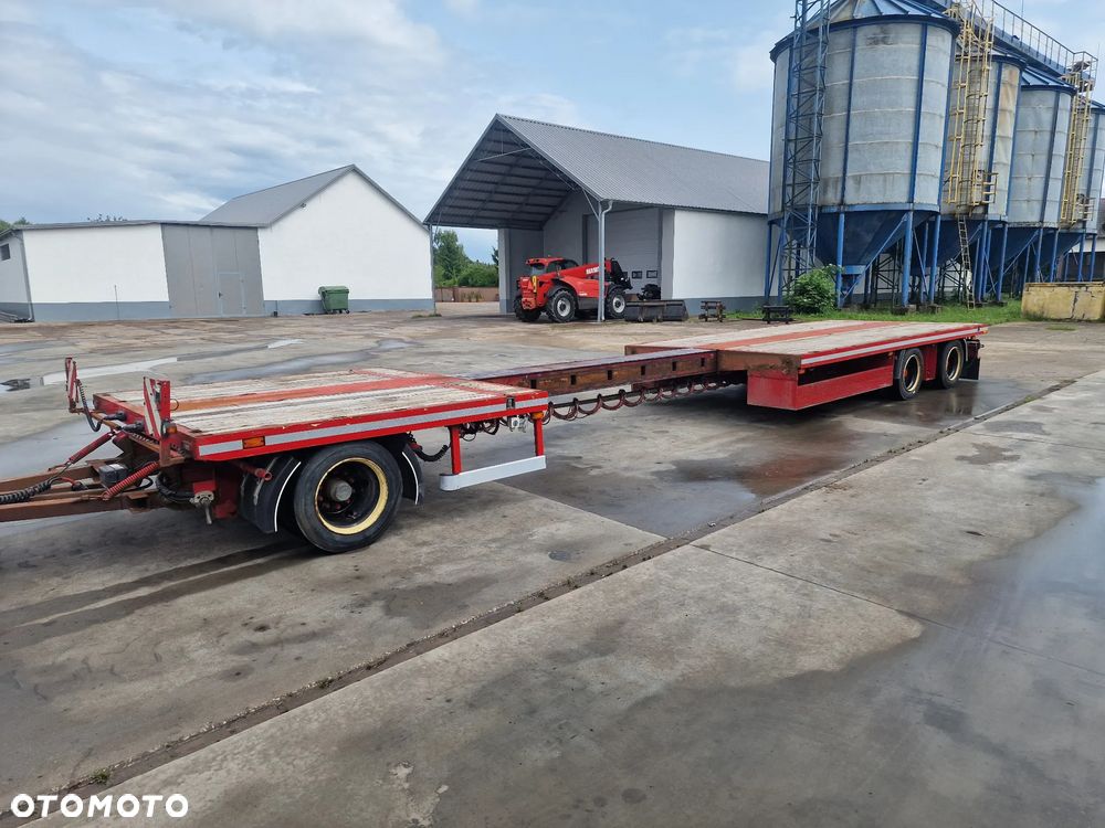 BROSHUIS przyczepa platforma niskopodwoziowa 2005 rok; ABS; pneumatyczne zawieszenie; 3 osie BPW; hamulce bębnowe; ostatnia oś podnoszona; długość 7,50 m + rozciągana 3,50 m; szerokość 2, 48 m (możliwość poszerzenia); wysokość: 0,80 m; DMC: 19800 kg; masa własna: 5850 kg; ładowność: 13950 kg;