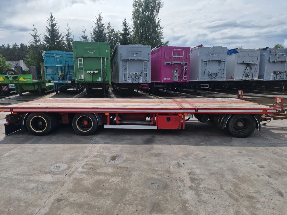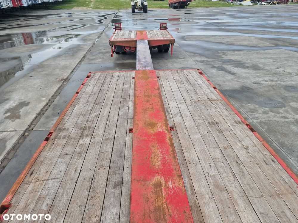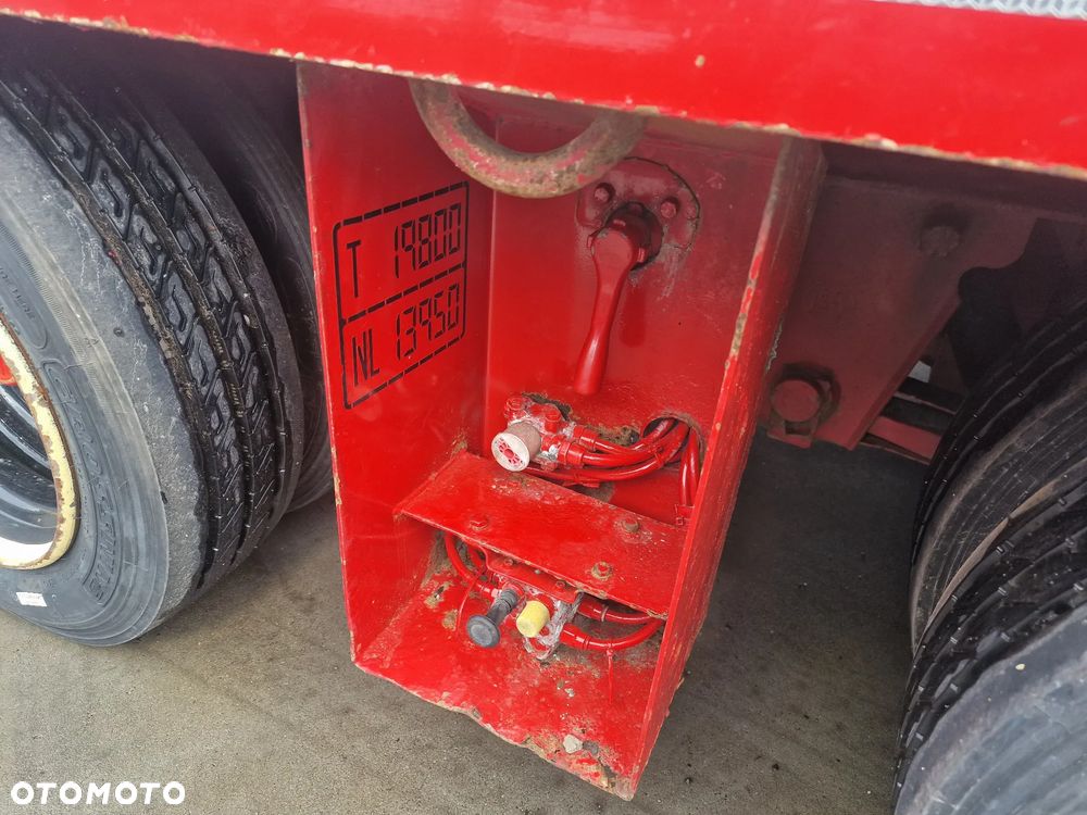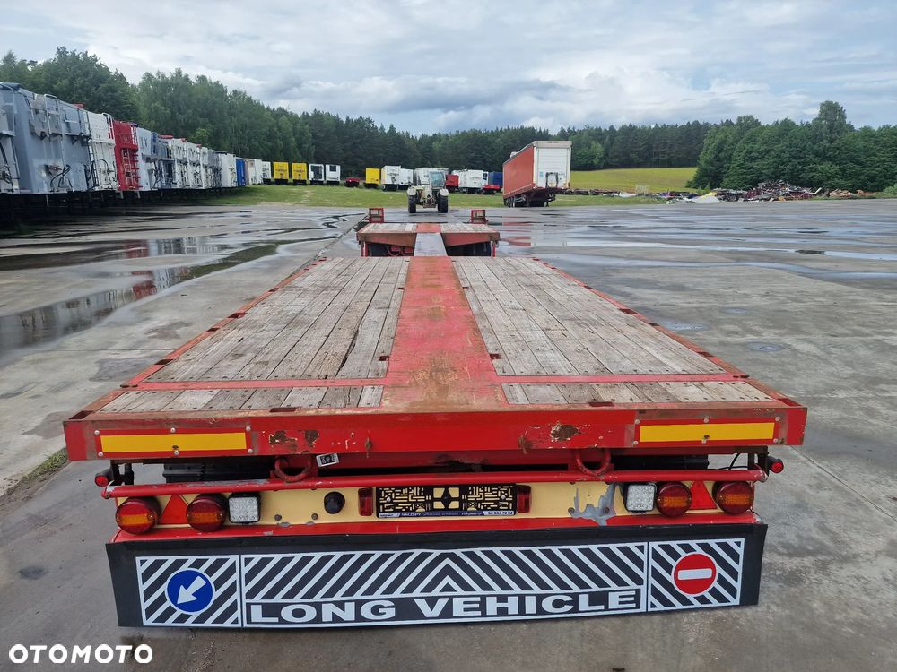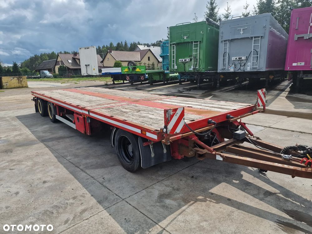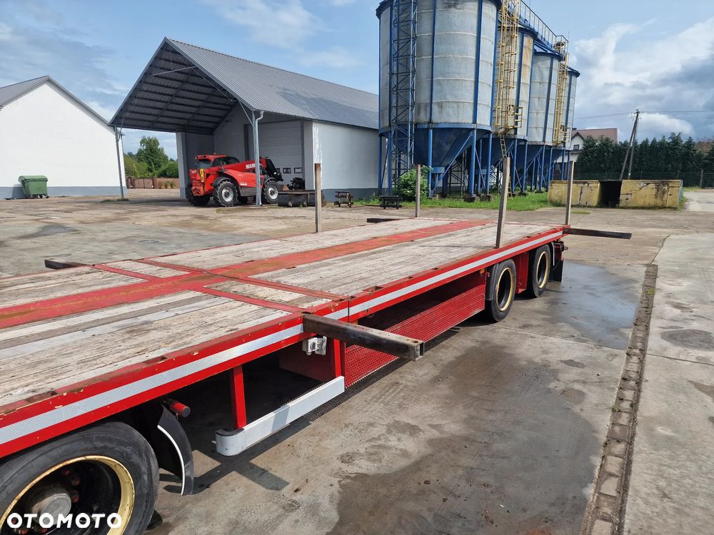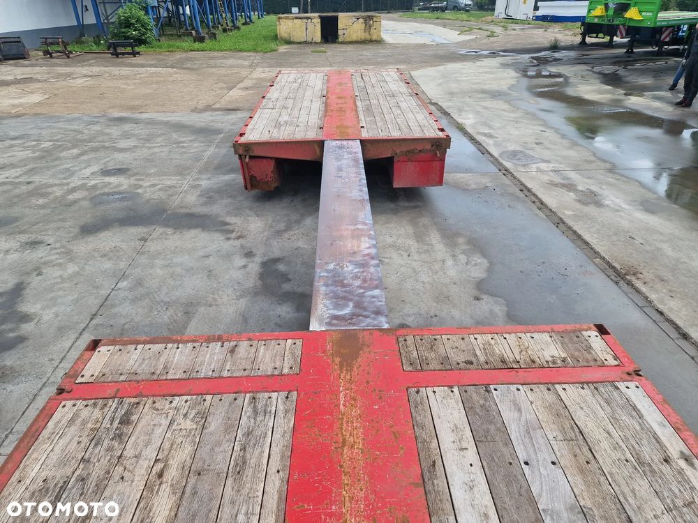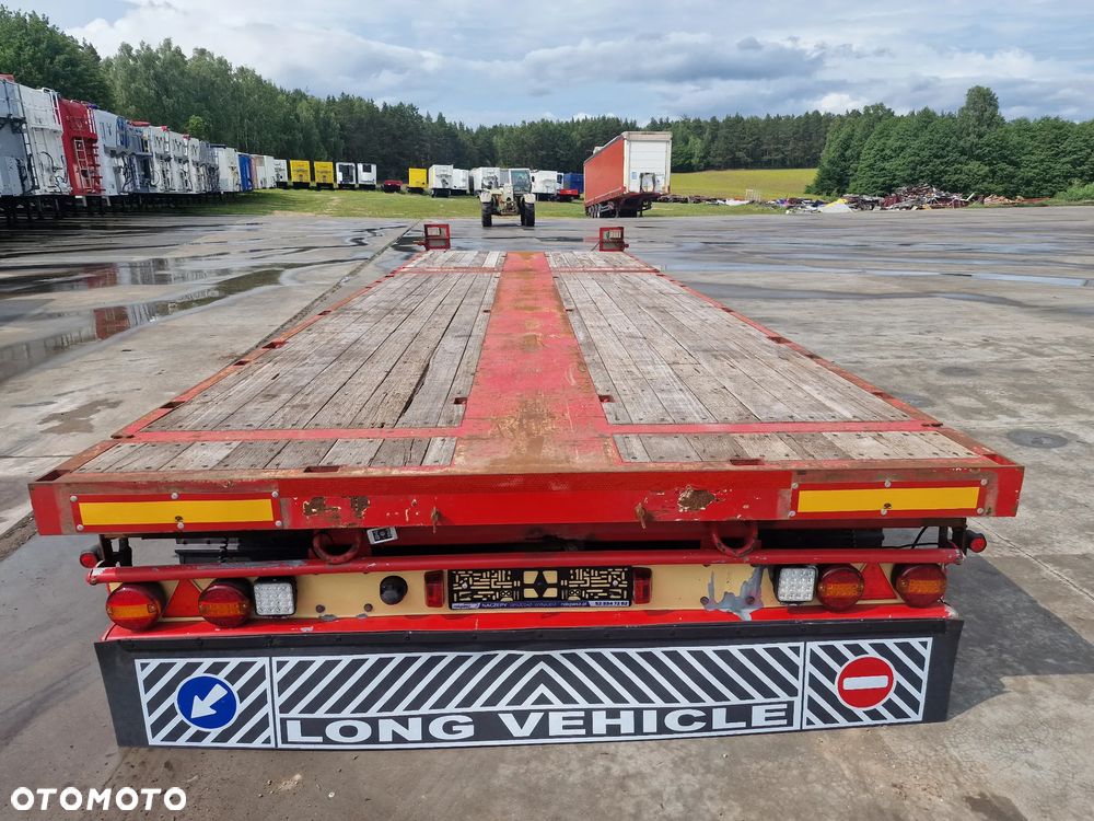 BROSHUIS przyczepa platforma niskopodwoziowa 2005 rok; ABS; pneumatyczne zawieszenie; 3 osie BPW; hamulce bębnowe; ostatnia oś podnoszona; długość 7,50 m + rozciągana 3,50 m; szerokość 2, 48 m (możliwość poszerzenia); wysokość: 0,80 m; DMC: 19800 kg; masa własna: 5850 kg; ładowność: 13950 kg;