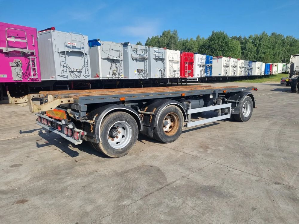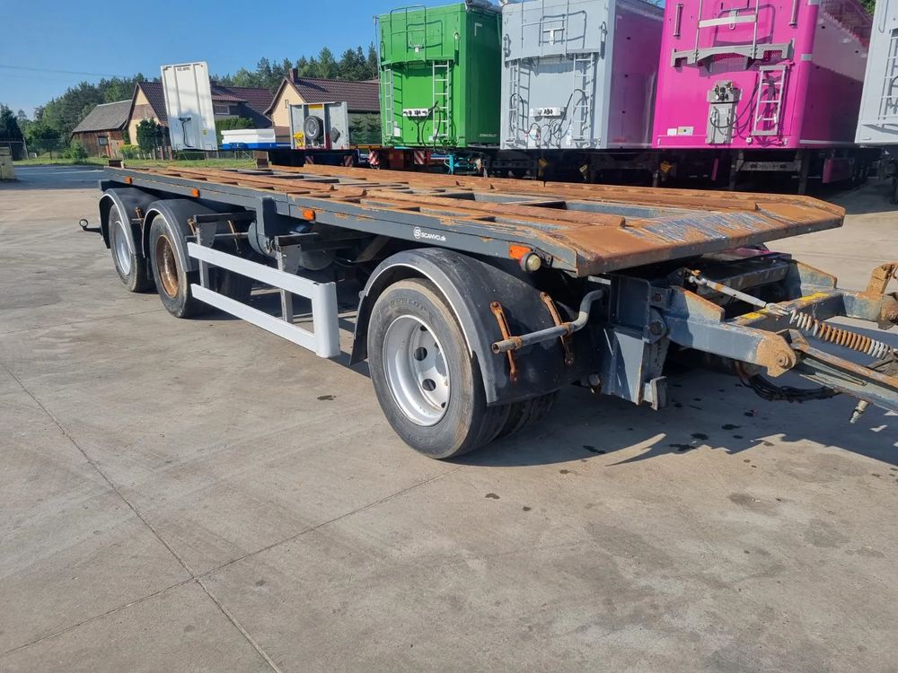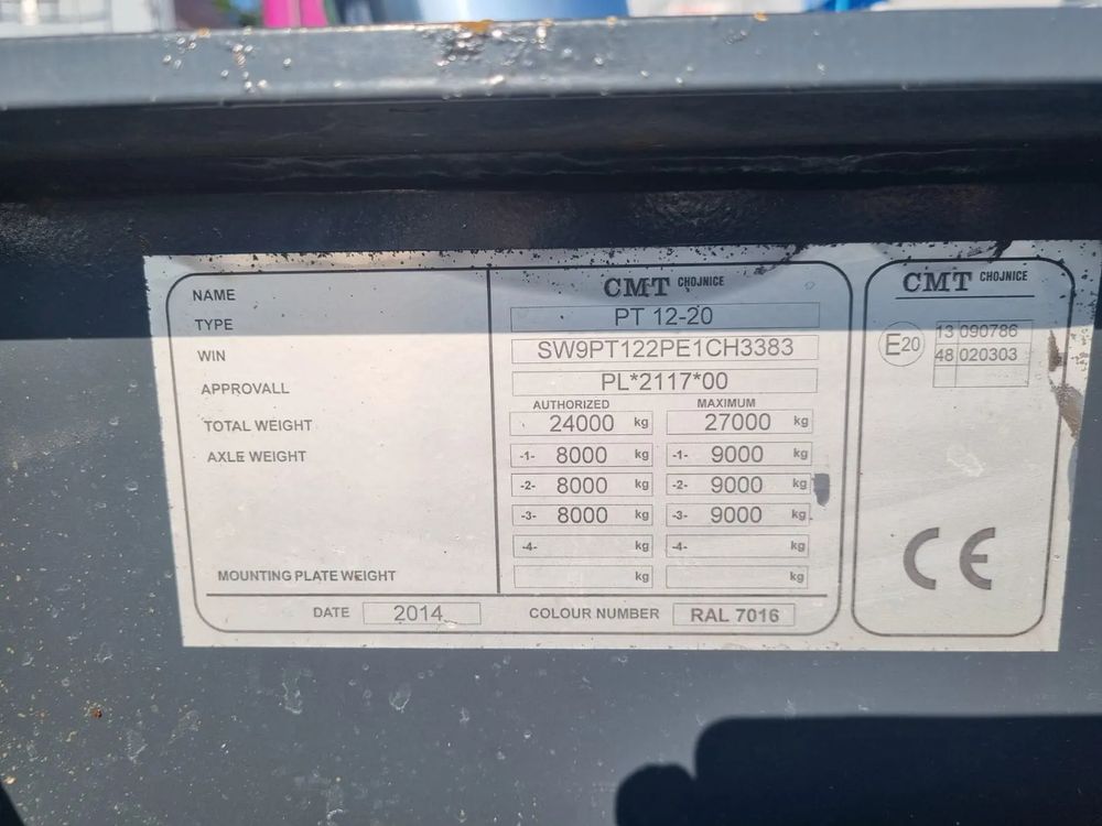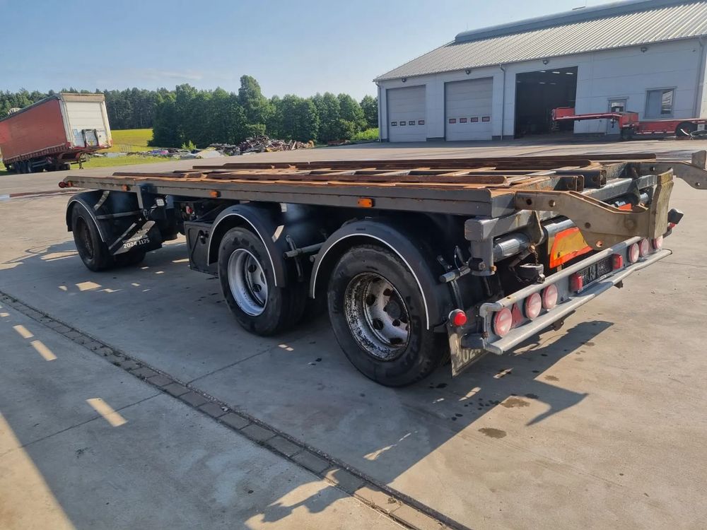 CMT przyczepa hakowiec z wywrotem do przewozu kontenerów; rok produkcji 2014; 3 osie BPW; hamulce bębnowe; ABS; pneumatyczne zawieszenie; oś podnoszona; DMC: 24000 kg; długość 6,50 m-7,00 m; rozmiar opon: 265/70r19,5;