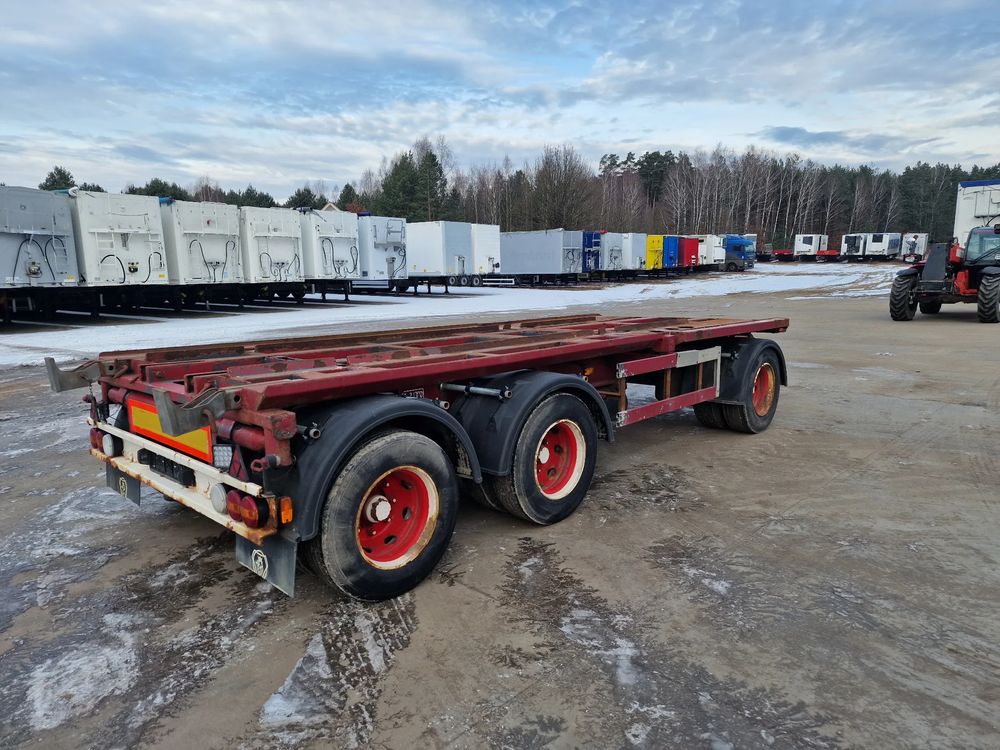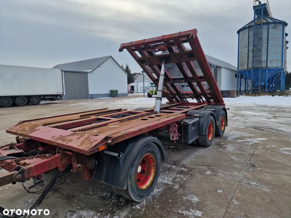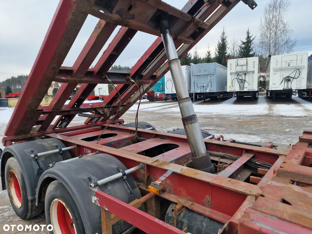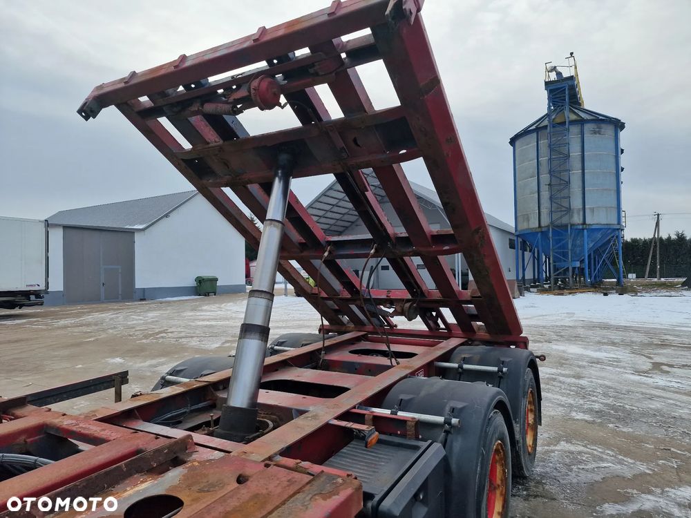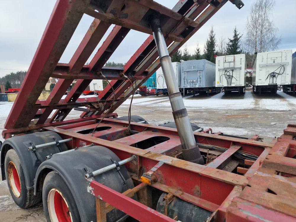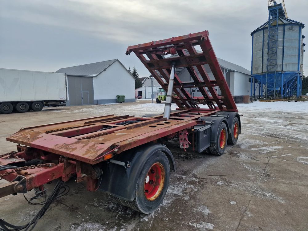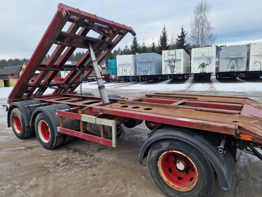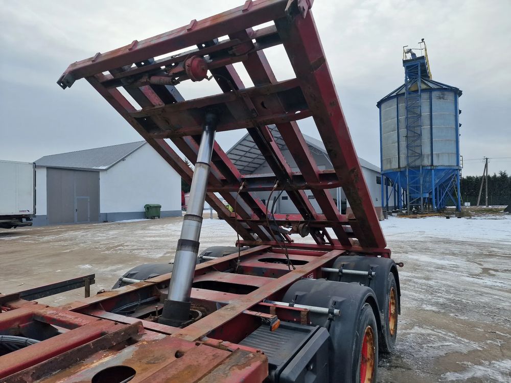 KEL-BERG przyczepa hakowiec z wywrotem do przewozu kontenerów; rok produkcji 2005; 3 osie BPW; hamulce bębnowe; ABS; pneumatyczne zawieszenie; DMC: 24000 kg; ładowność: 18000 kg; rozmiar opon: 265/70r19,5;
