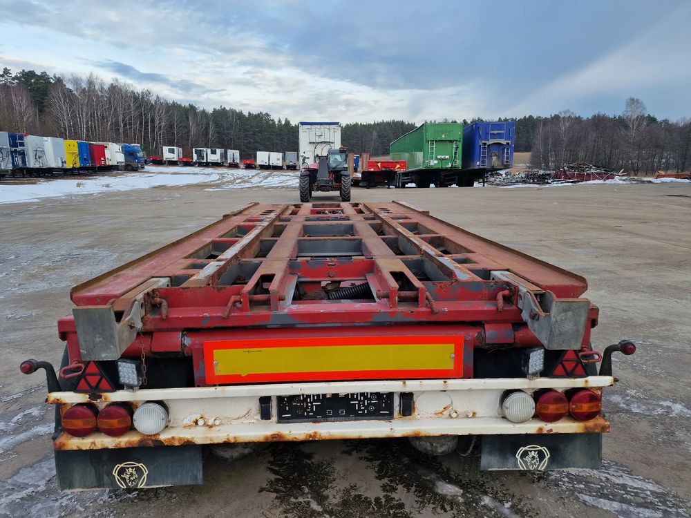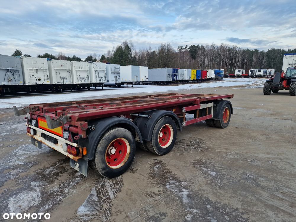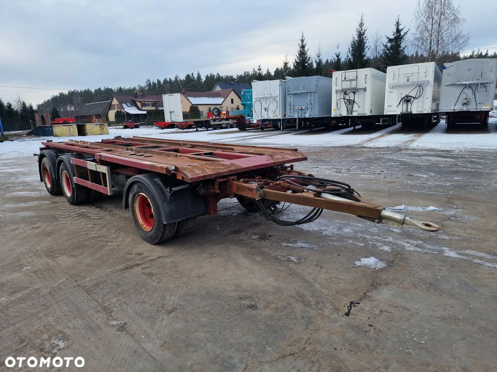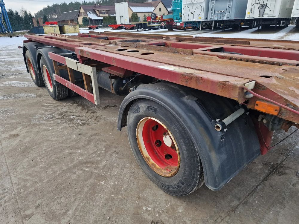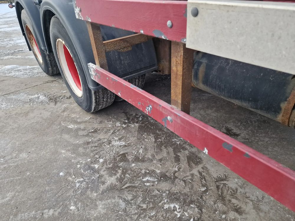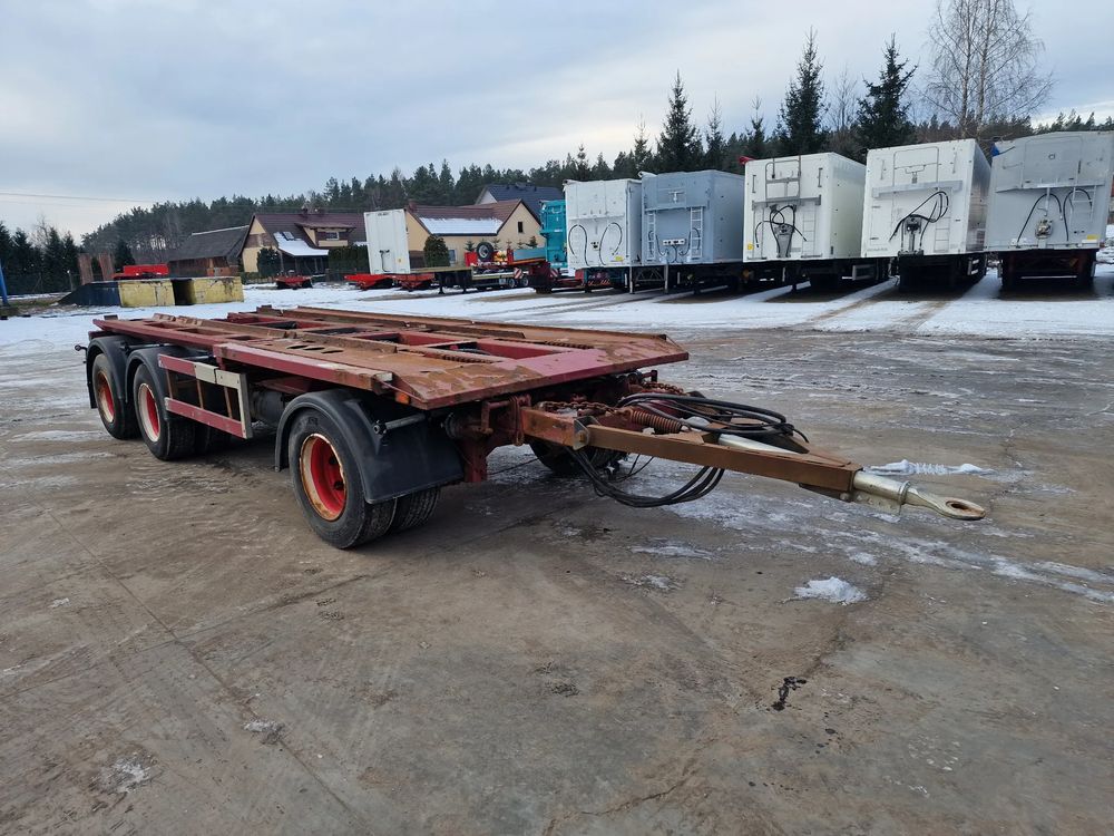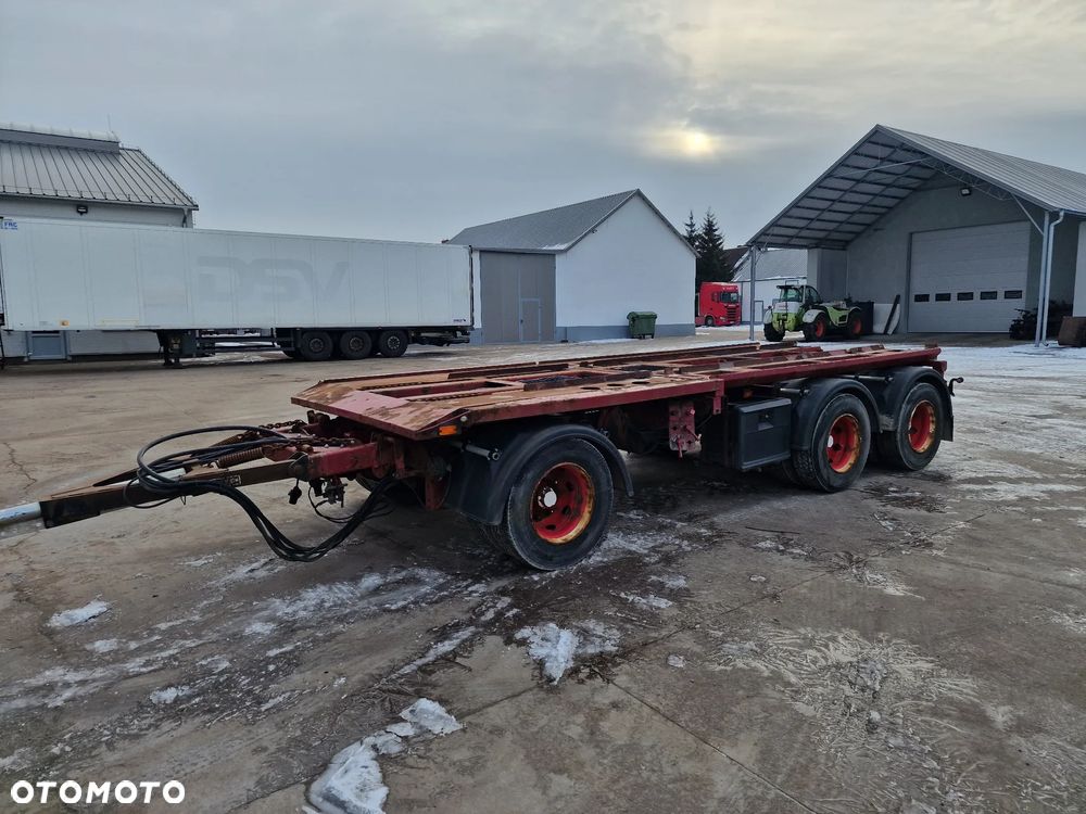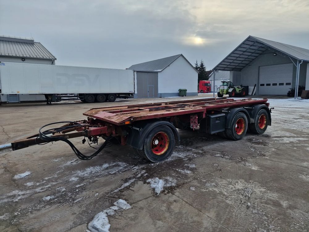 KEL-BERG przyczepa hakowiec z wywrotem do przewozu kontenerów; rok produkcji 2005; 3 osie BPW; hamulce bębnowe; ABS; pneumatyczne zawieszenie; DMC: 24000 kg; ładowność: 18000 kg; rozmiar opon: 265/70r19,5;