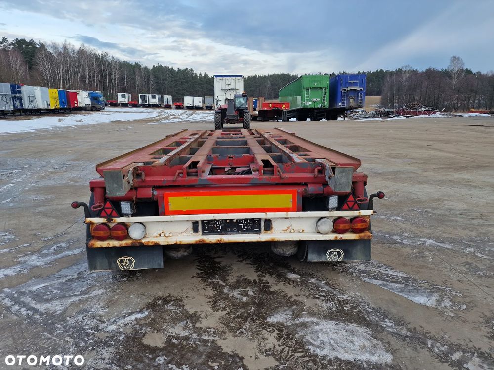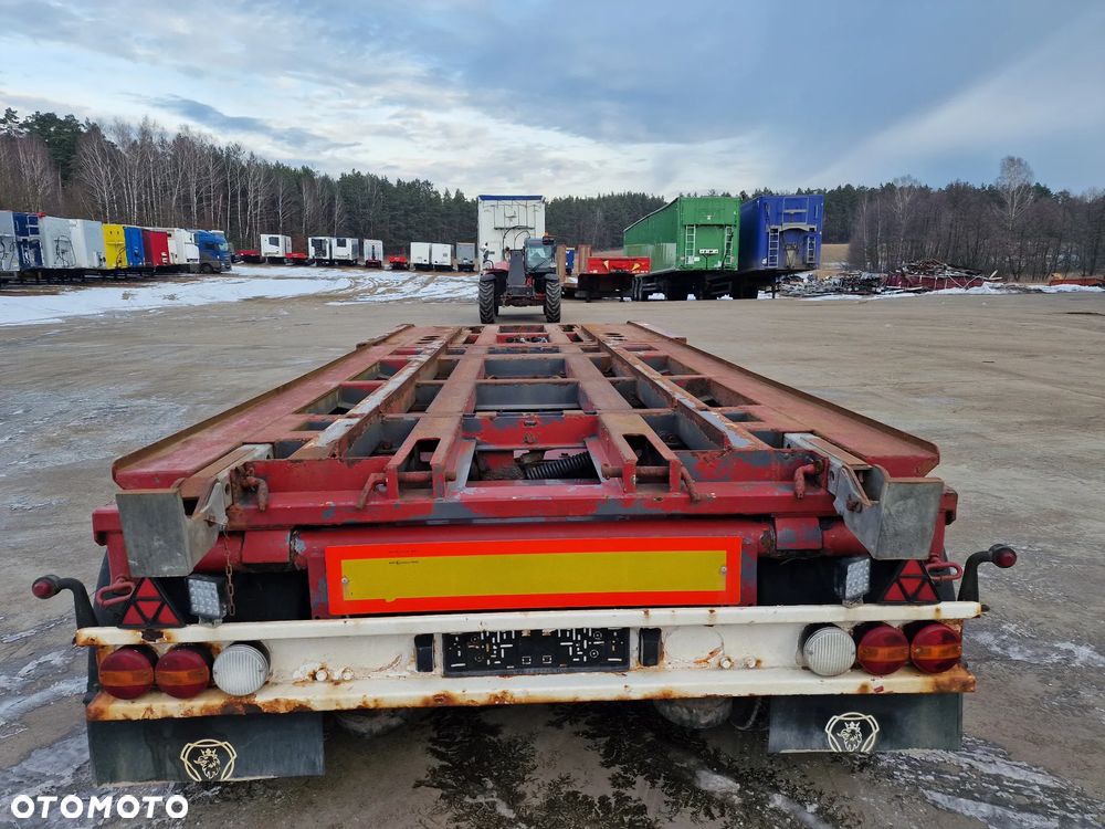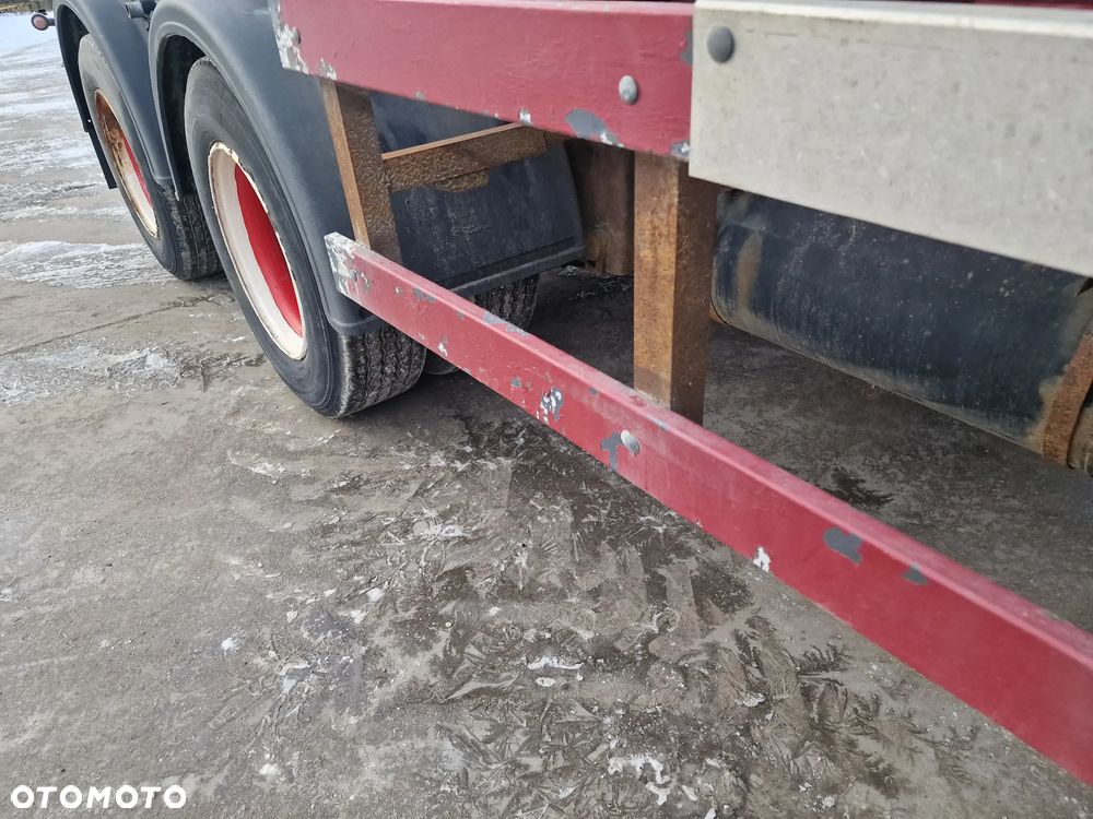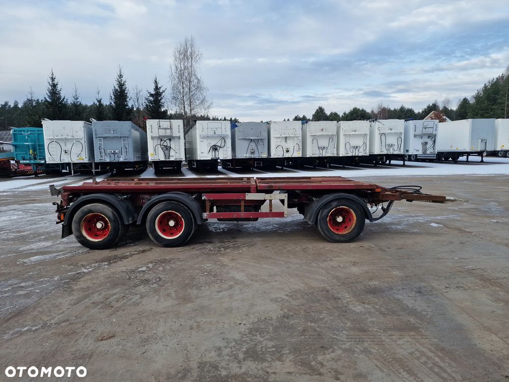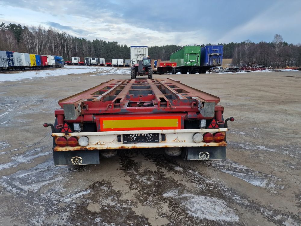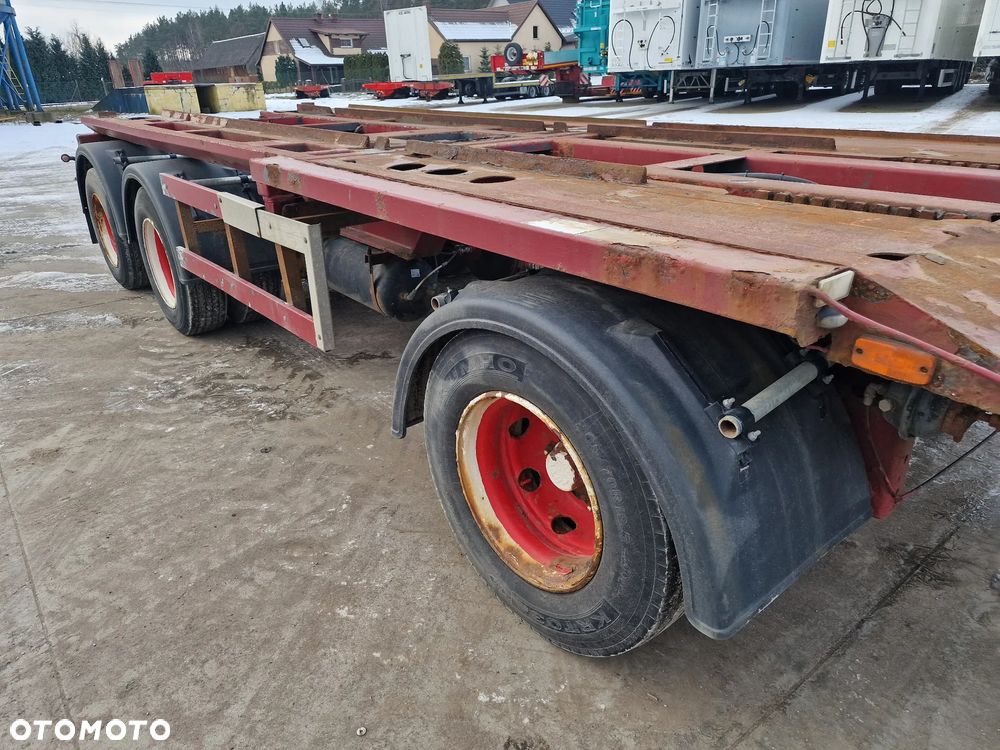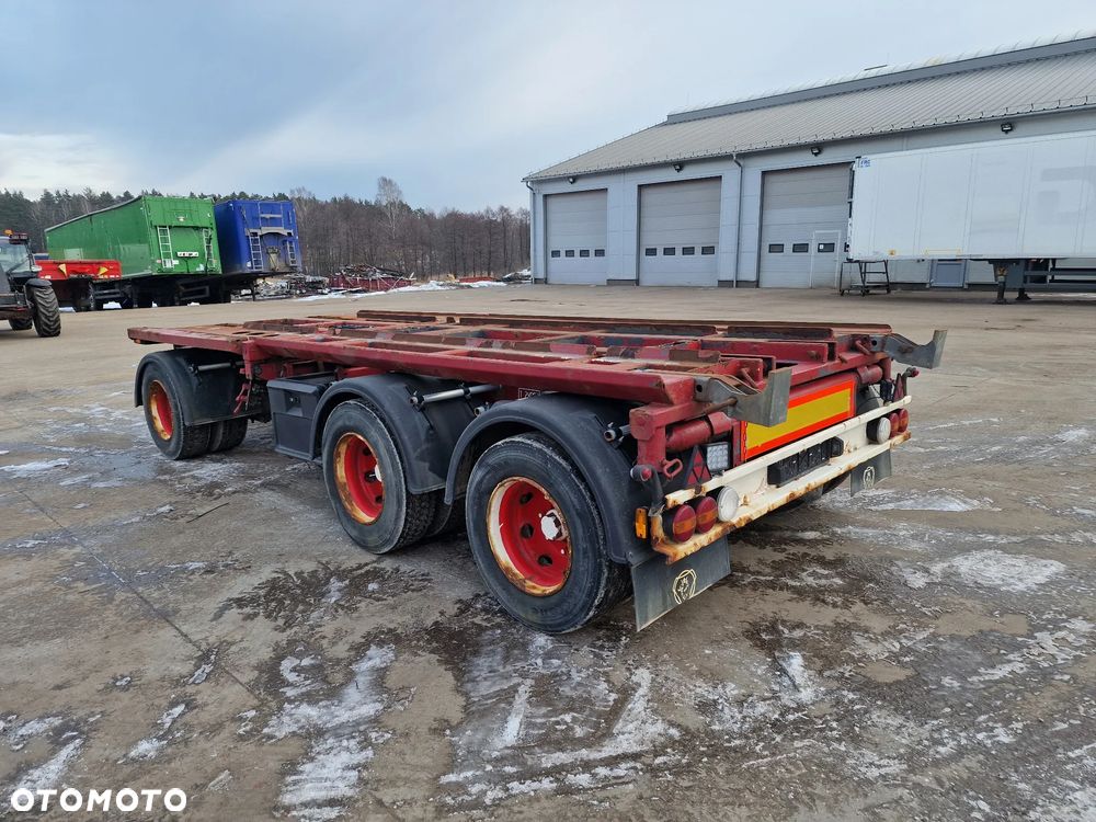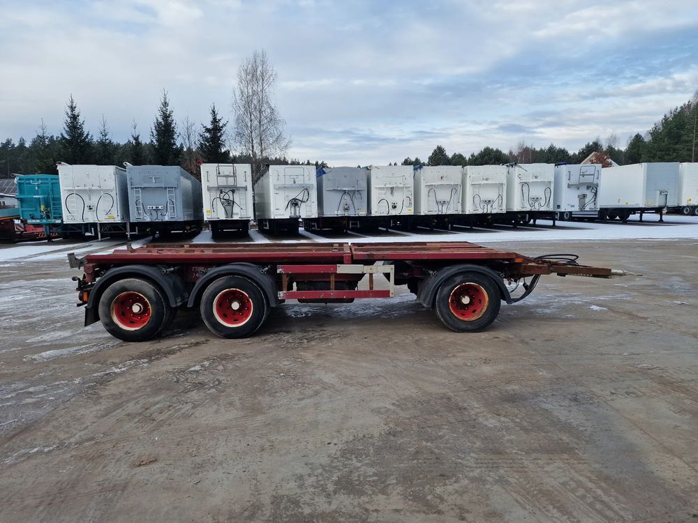 KEL-BERG przyczepa hakowiec z wywrotem do przewozu kontenerów; rok produkcji 2005; 3 osie BPW; hamulce bębnowe; ABS; pneumatyczne zawieszenie; DMC: 24000 kg; ładowność: 18000 kg; rozmiar opon: 265/70r19,5;