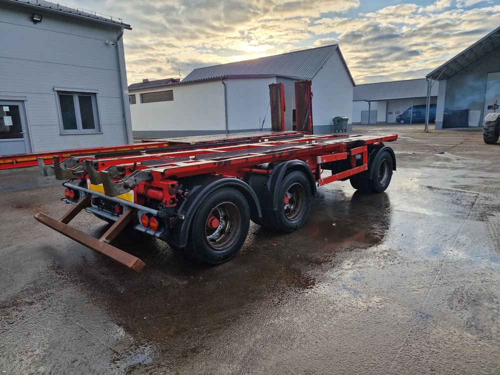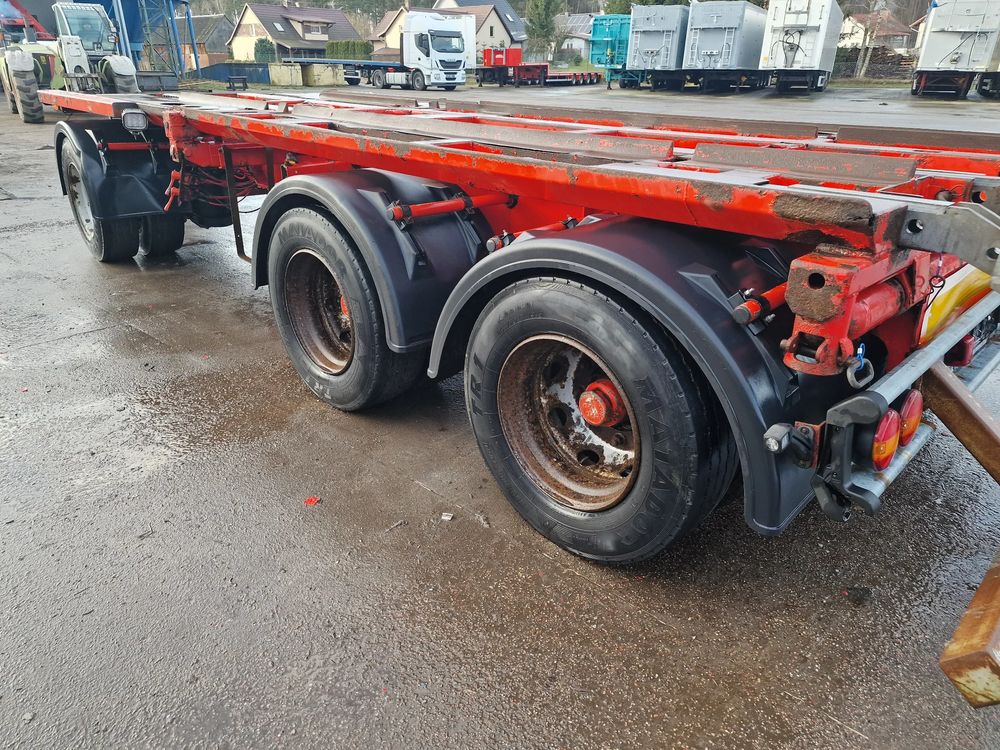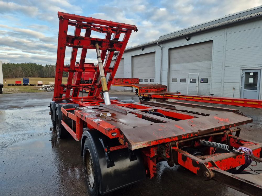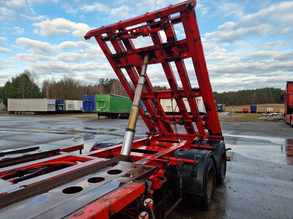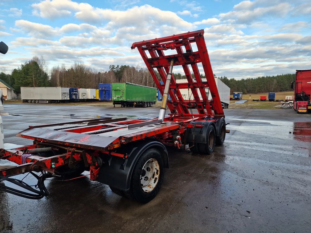 KEL-BERG przyczepa hakowiec z wywrotem do przewozu kontenerów; rok produkcji 2005; 3 osie BPW; hamulce bębnowe; ABS; pneumatyczne zawieszenie; DMC: 24000 kg; ładowność: 18000 kg; długość 6,50 m; rozmiar opon: 265/70r19,5;