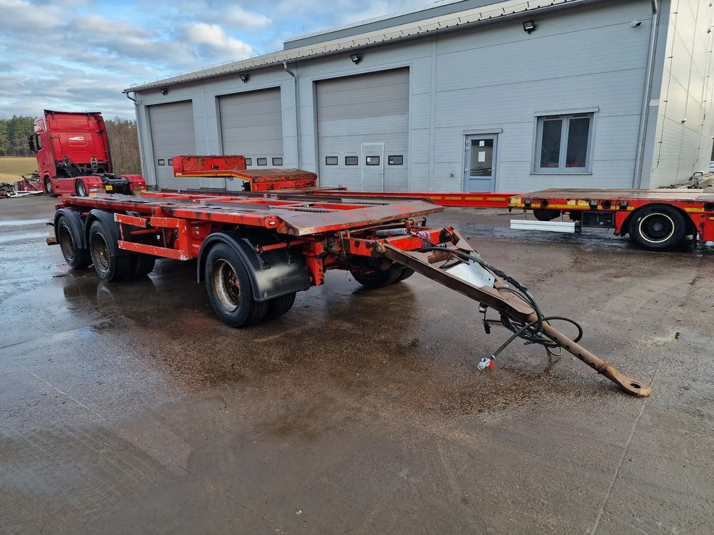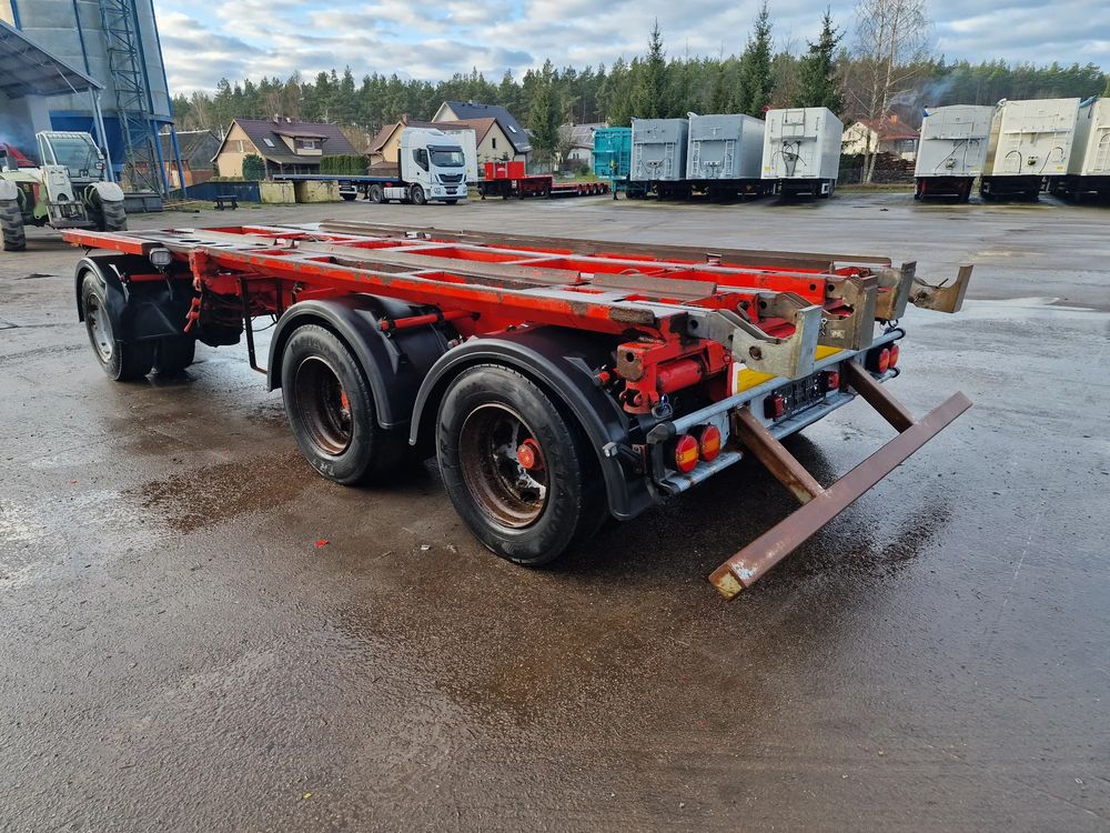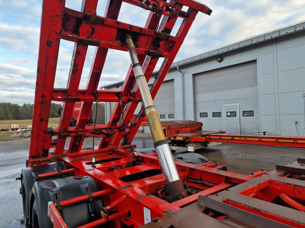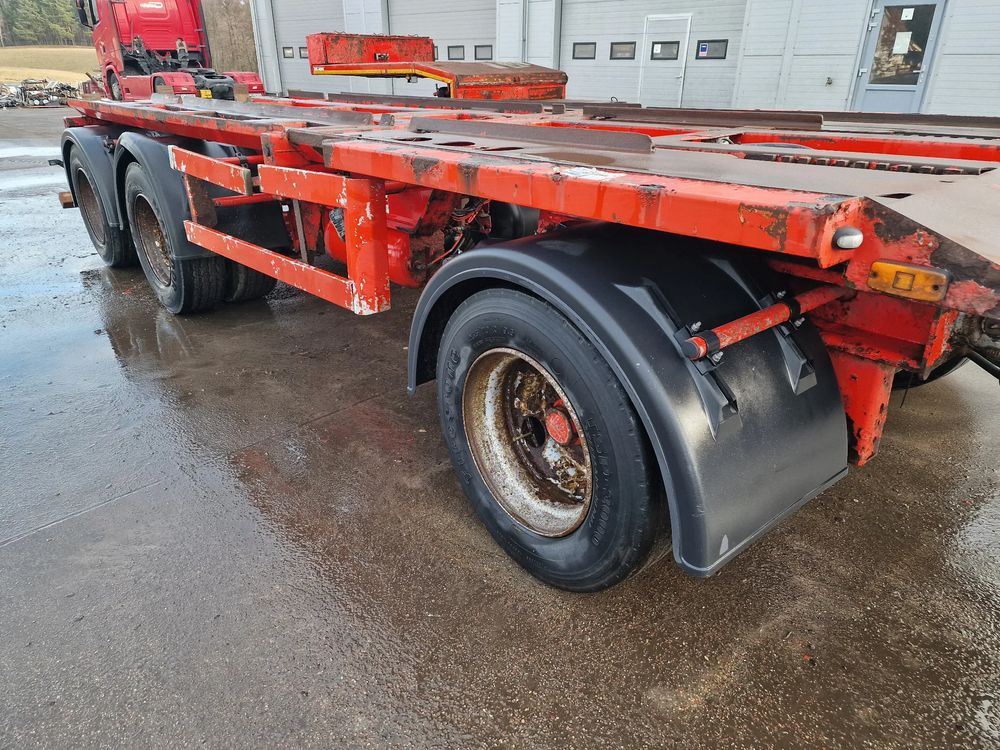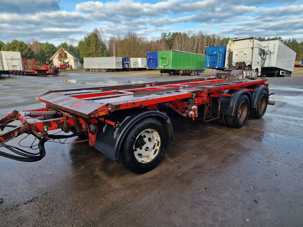 KEL-BERG przyczepa hakowiec z wywrotem do przewozu kontenerów; rok produkcji 2005; 3 osie BPW; hamulce bębnowe; ABS; pneumatyczne zawieszenie; DMC: 24000 kg; ładowność: 18000 kg; długość 6,50 m; rozmiar opon: 265/70r19,5;