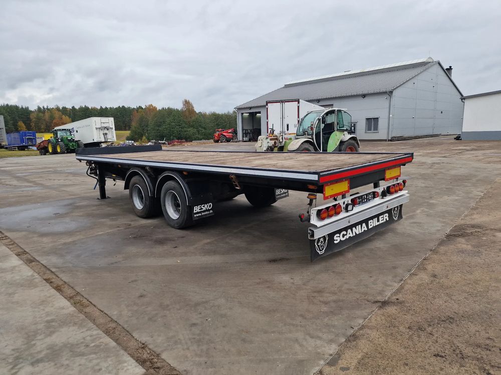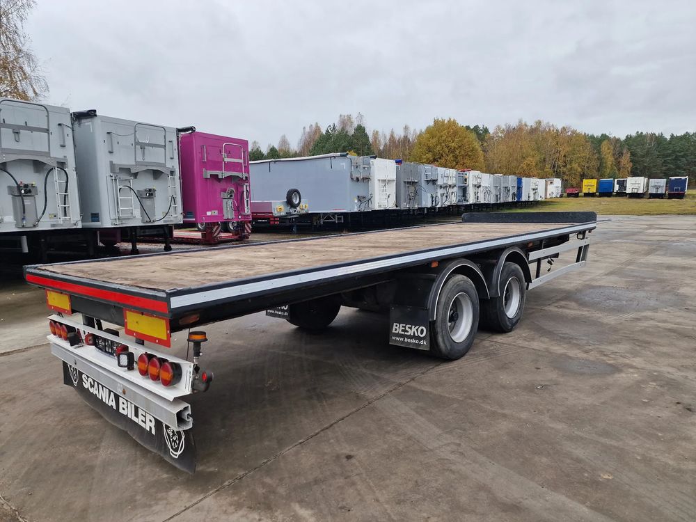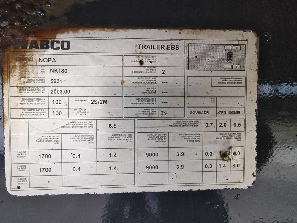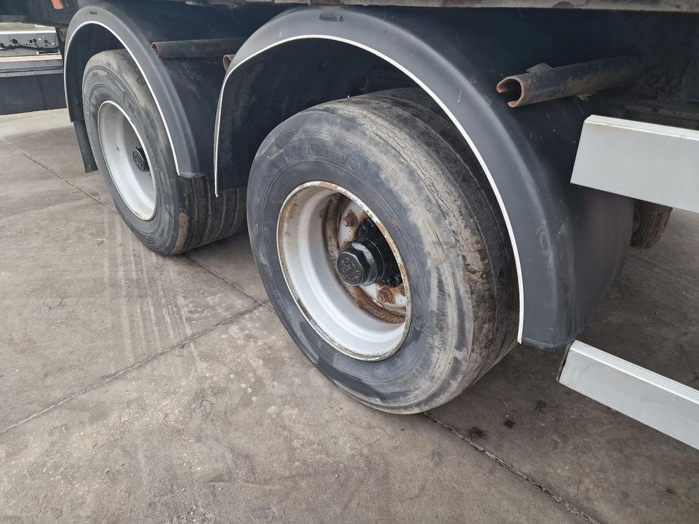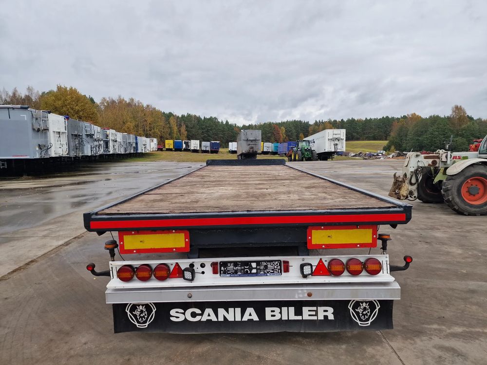 NOPA przyczepa platforma TANDEM 2001 rok; ABS; pneumatyczne zawieszenie; hamulce bębnowe; rozmiar opon: 445/45R19,5; DMC: 18000 kg; masa własna: 4000 kg; ładowność: 14000 kg; wymiary platformy: 7,85 m x 2,55 m;